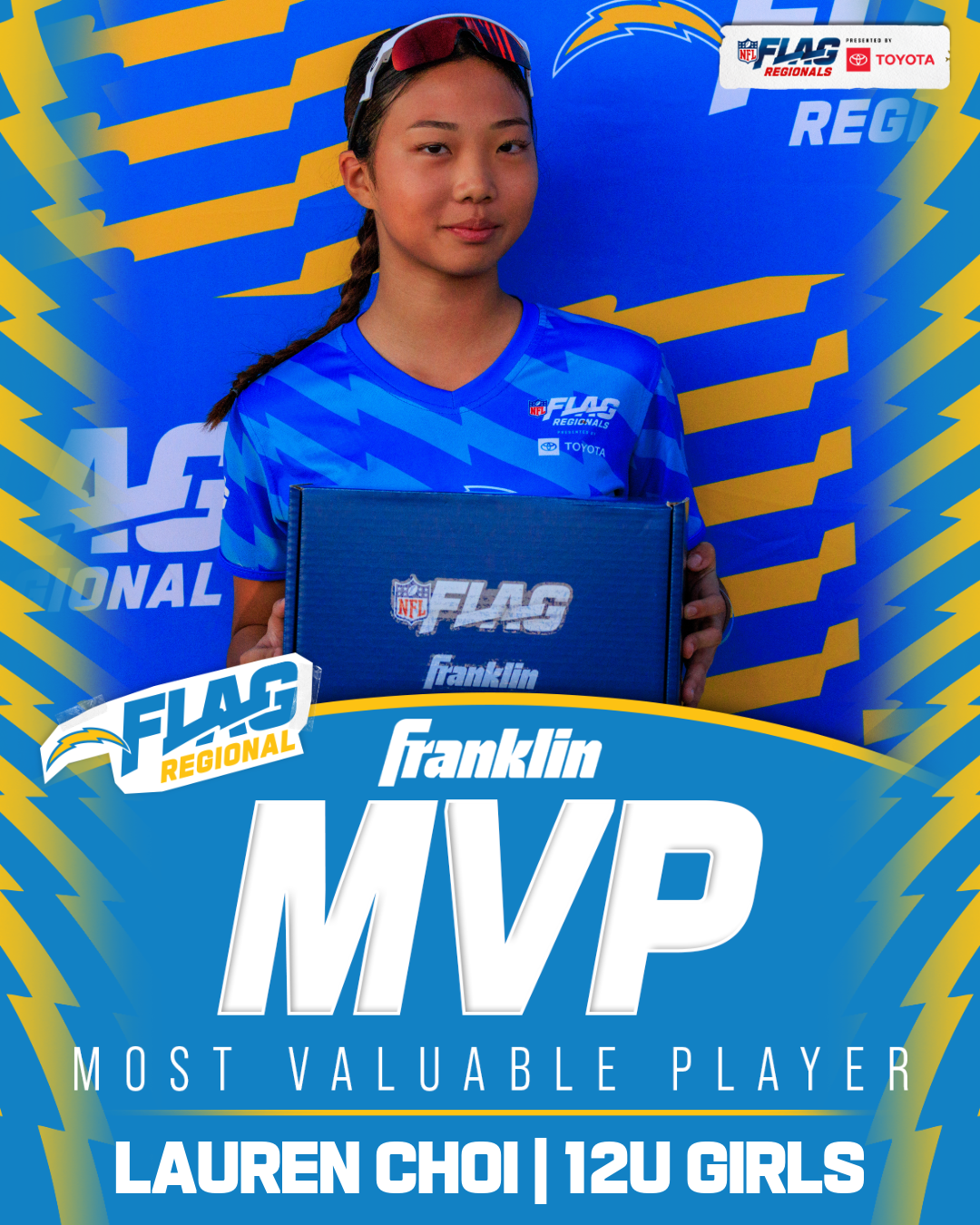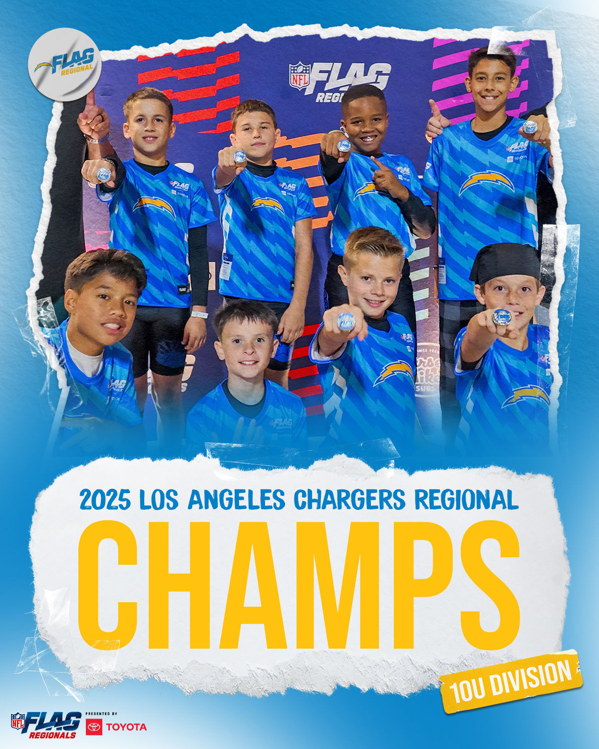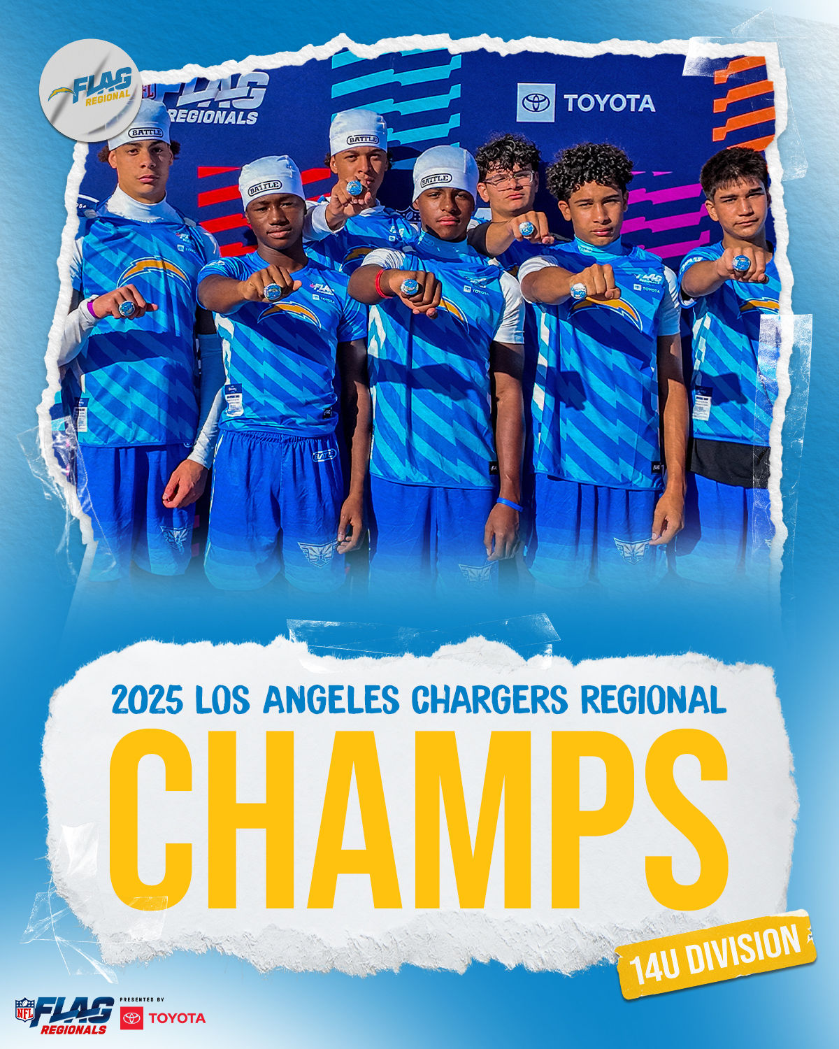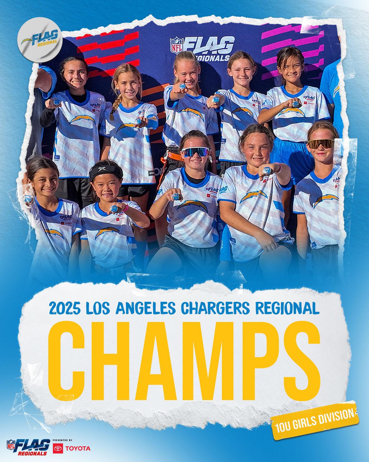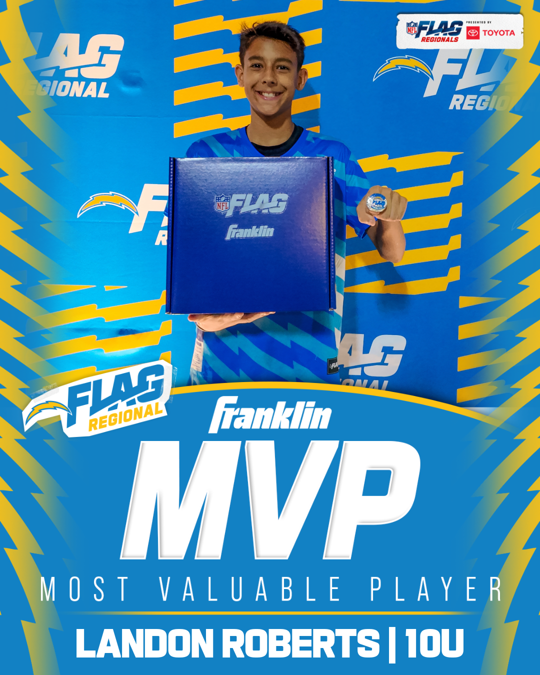 The only way to qualify for the NFL FLAG Championships is by winning a Regional or Super Regional Tournament. Qualified teams will receive a Full Bid entry to NFL FLAG Championships Presented by Toyota. Once a team qualifies, the entire roster (Athlete and Coaches) are FINAL. Edits may not be made to the rosters for the NFL FLAG Championships Presented by Toyota. Qualified players are ineligible to attend any other Regional Tournament in any division. Qualified teams are not permitted to change age divisions for the NFL FLAG Championships Presented by Toyota.