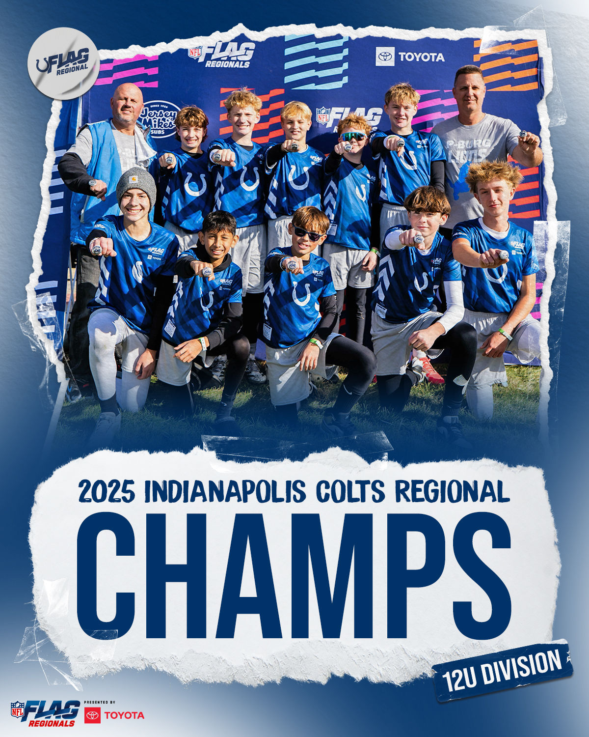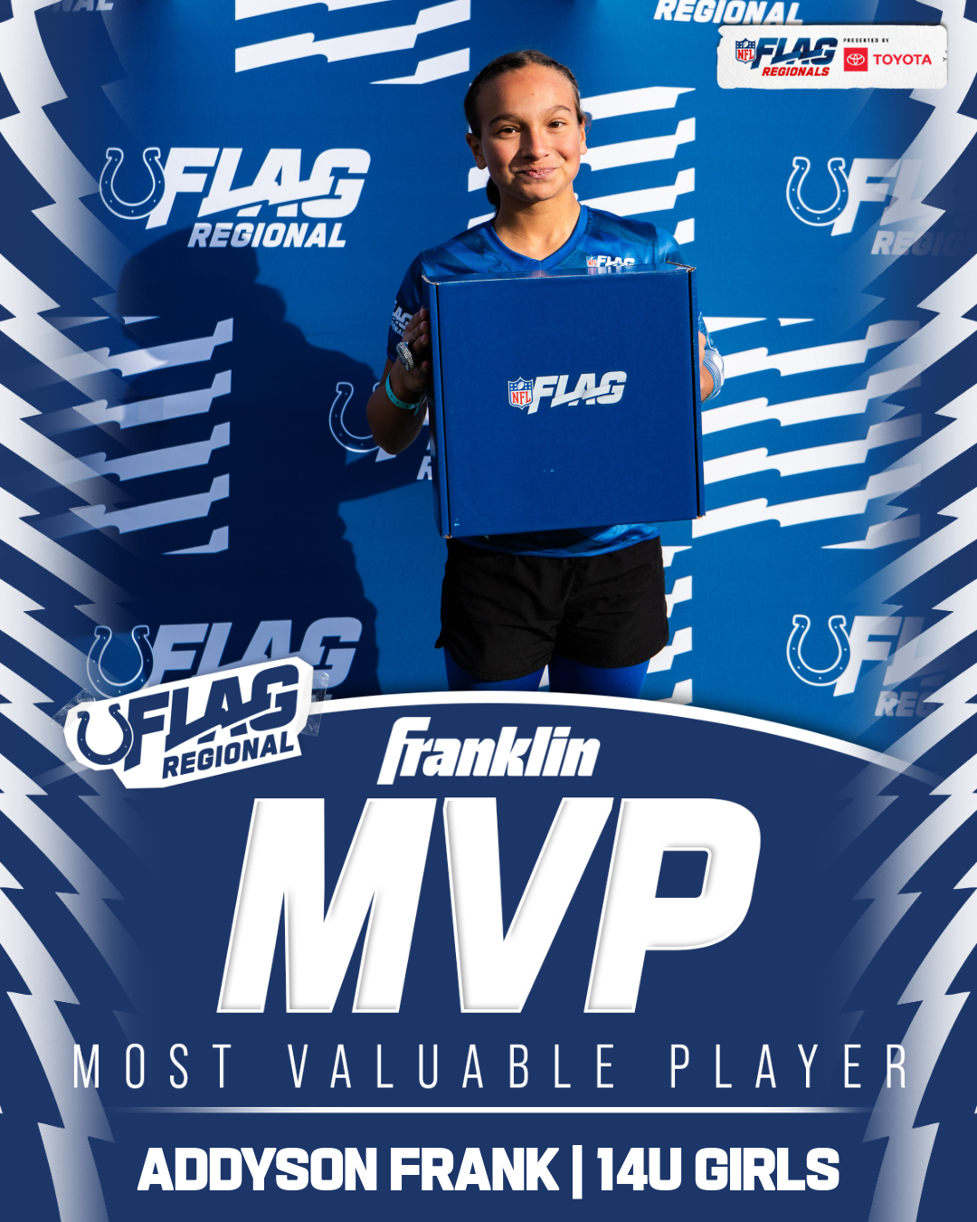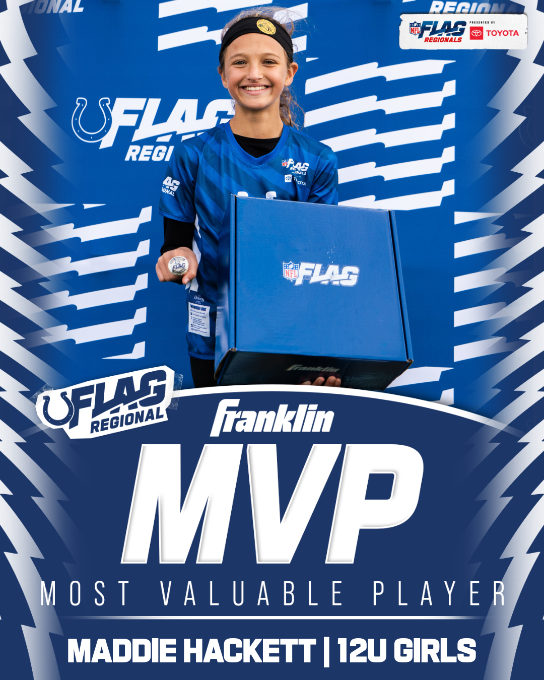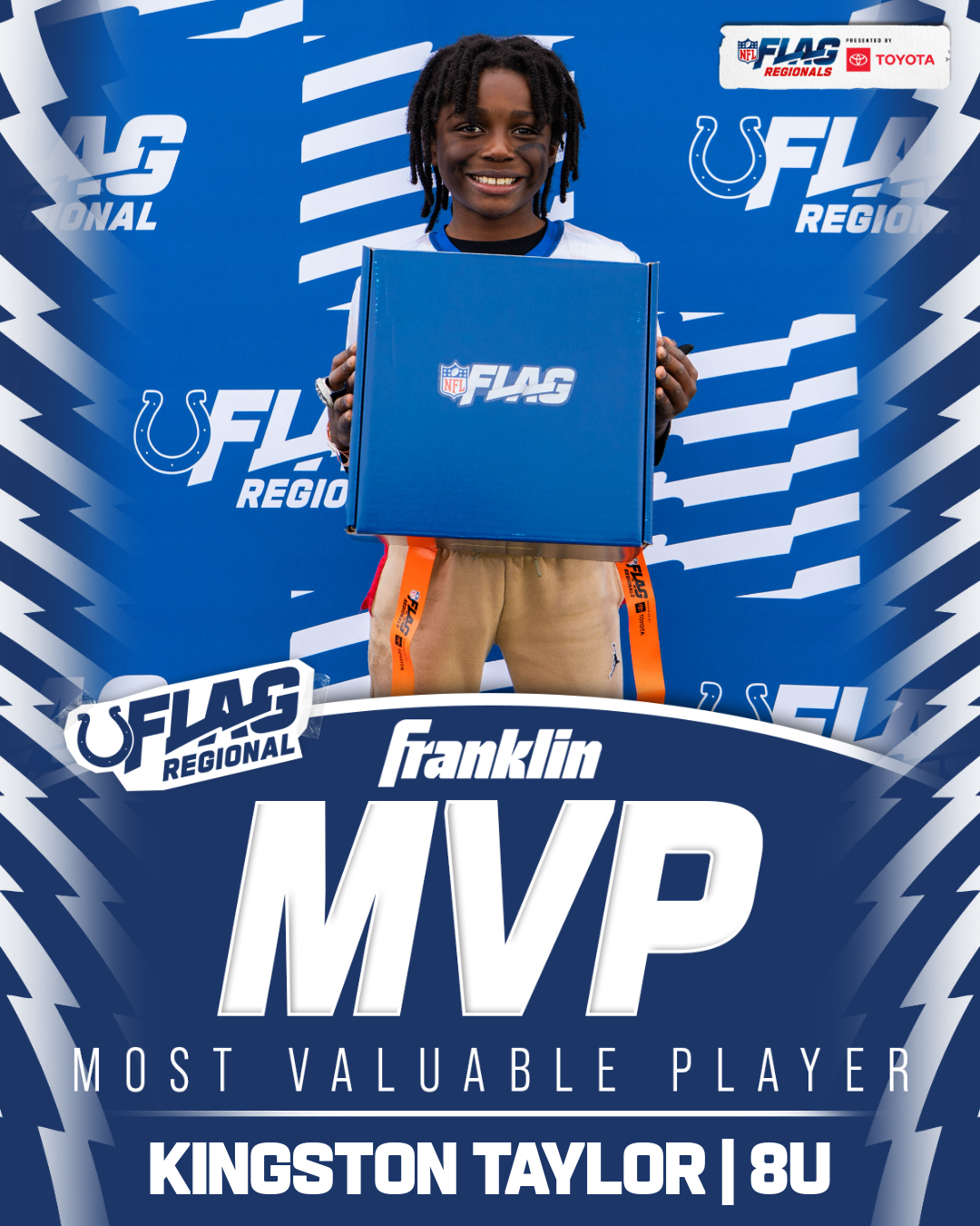 The only way to qualify for the NFL FLAG Championships is by winning a Regional or Super Regional Tournament. Qualified teams will receive a Full Bid entry to NFL FLAG Championships Presented by Toyota. Once a team qualifies, the entire roster (Athlete and Coaches) are FINAL. Edits may not be made to the rosters for the NFL FLAG Championships Presented by Toyota. Qualified players are ineligible to attend any other Regional Tournament in any division. Qualified teams are not permitted to change age divisions for the NFL FLAG Championships Presented by Toyota.