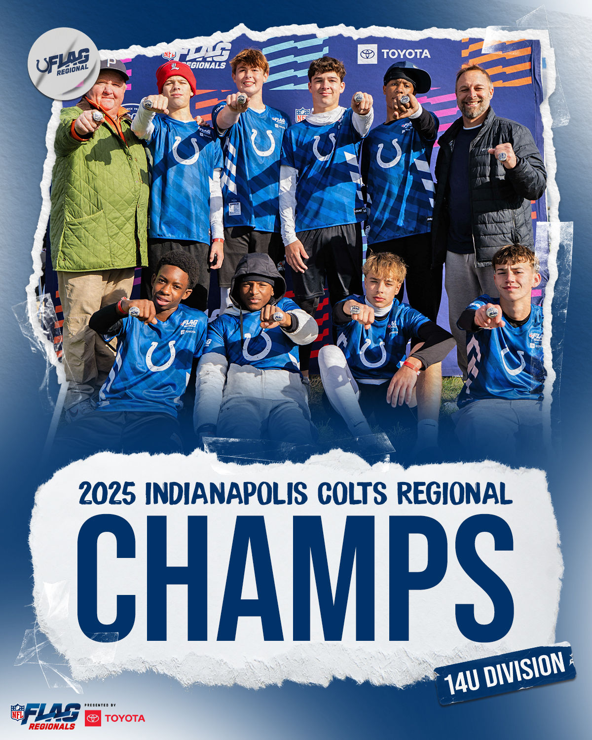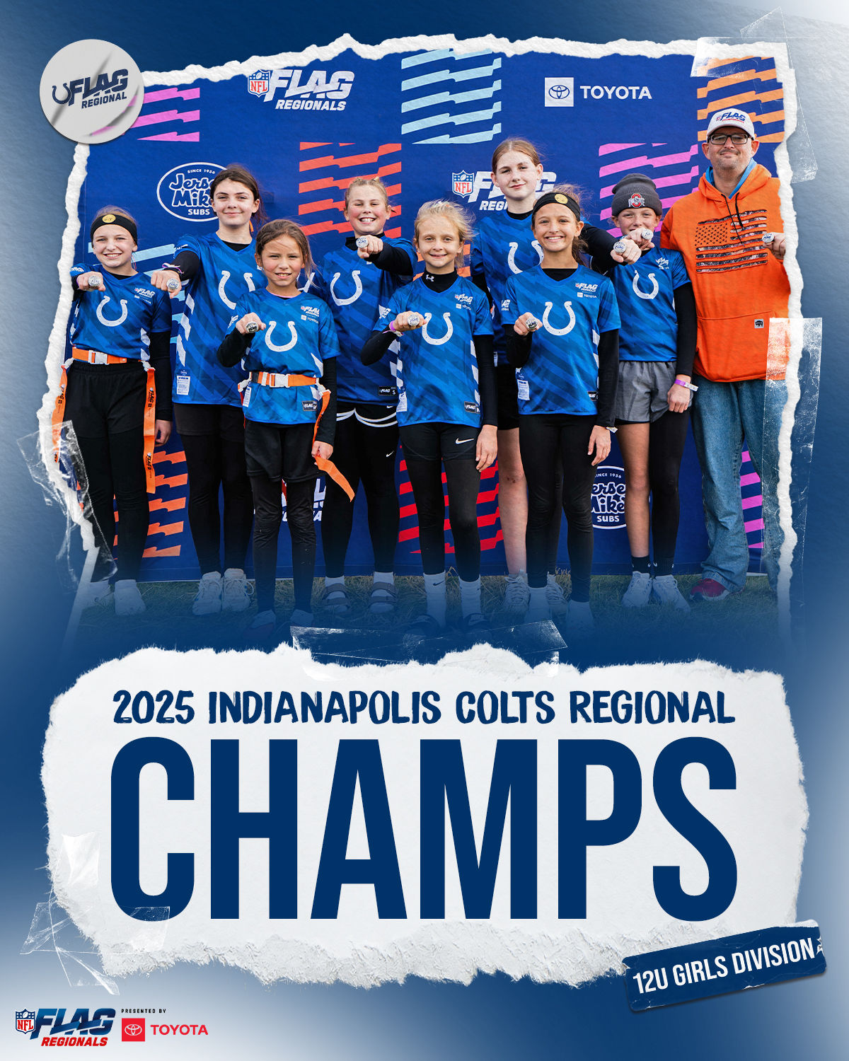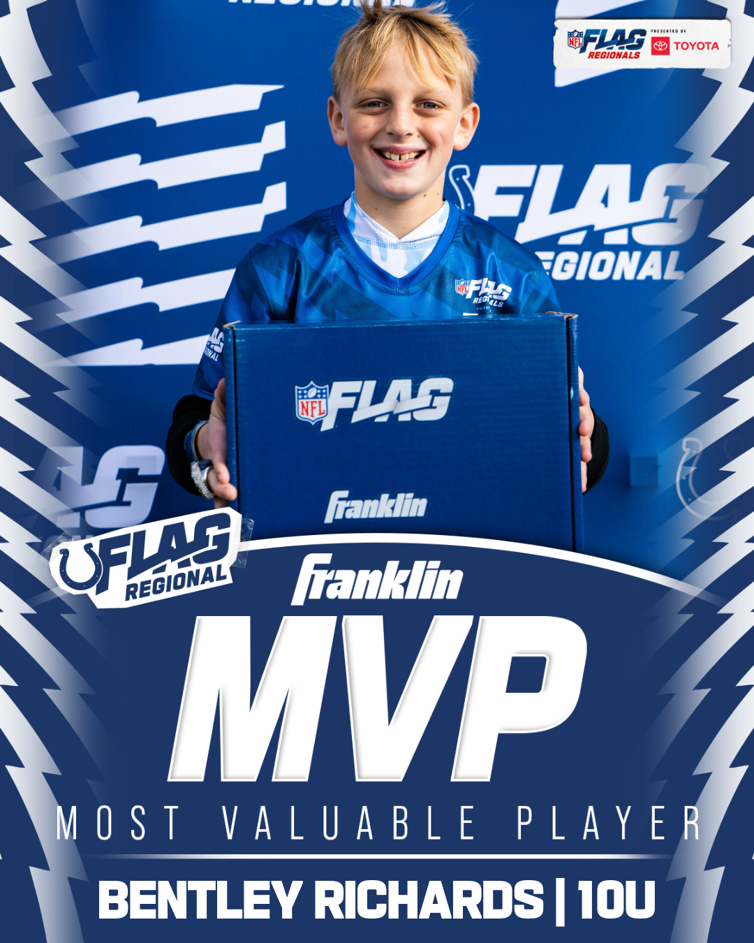 The only way to qualify for the NFL FLAG Championships is by winning a Regional or Super Regional Tournament. Qualified teams will receive a Full Bid entry to NFL FLAG Championships Presented by Toyota. Once a team qualifies, the entire roster (Athlete and Coaches) are FINAL. Edits may not be made to the rosters for the NFL FLAG Championships Presented by Toyota. Qualified players are ineligible to attend any other Regional Tournament in any division. Qualified teams are not permitted to change age divisions for the NFL FLAG Championships Presented by Toyota.