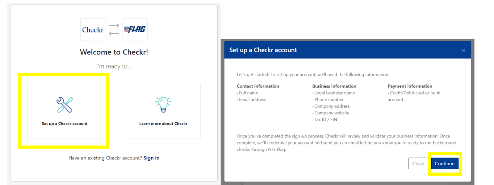 Setup: Select “Set up a Checkr account”, review the required information, and click “Continue”.