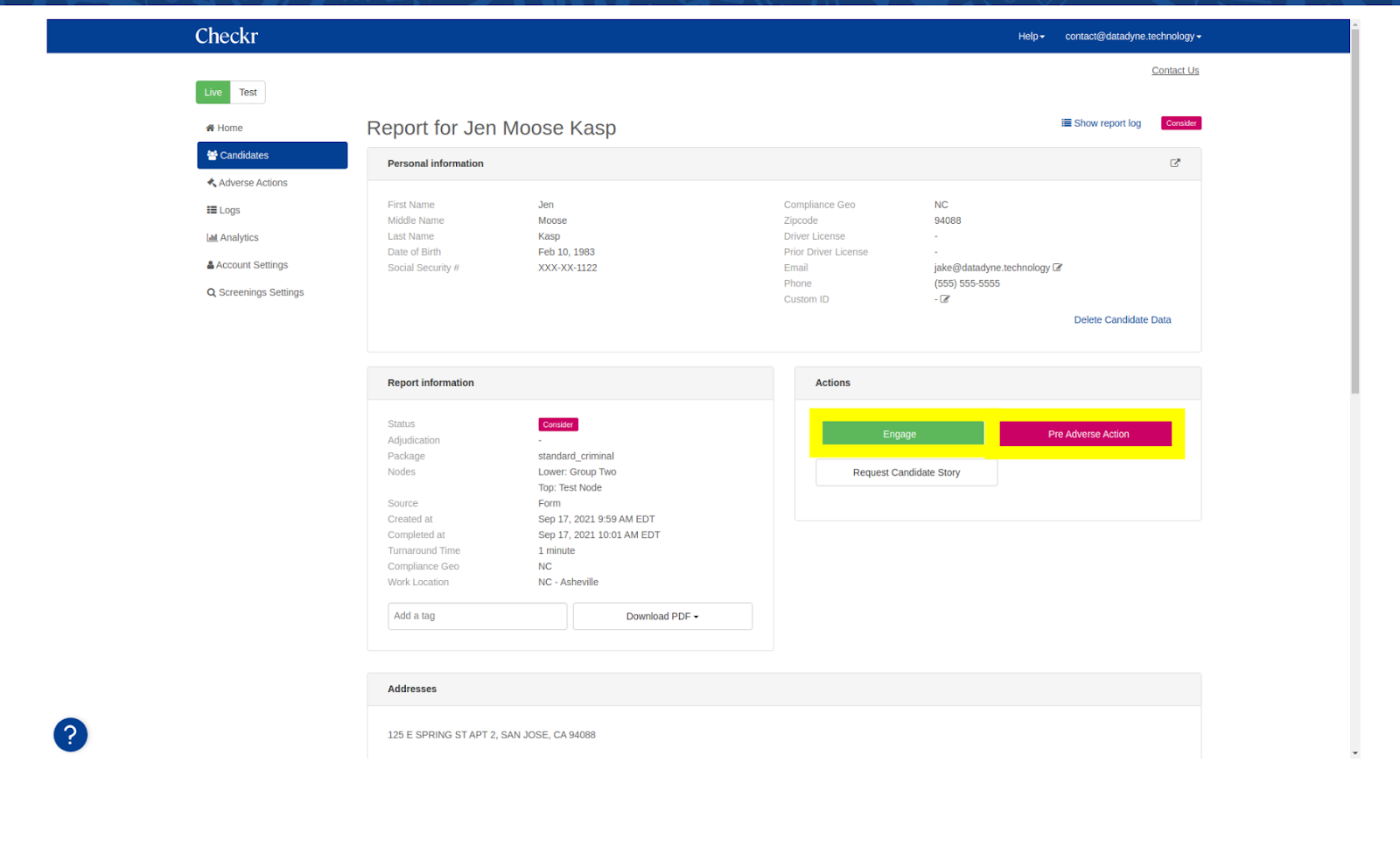 To review background checks, log into your Checkr account through Matrix by selecting Admin > Background Check > Login to Checkr. For checks with a “Consider” status, click “View Report” to see the detailed report, where items of concern will be highlighted in red or pink. Carefully review the report: if it disqualifies the coach, issue a Pre-Adverse Action notification. If the report is clear, mark the coach as clear by clicking the green “Engage” button.