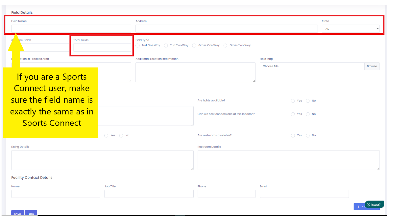 Navigate to Admin > Locations and enter the details for each of your field locations. Required fields will be marked in red.