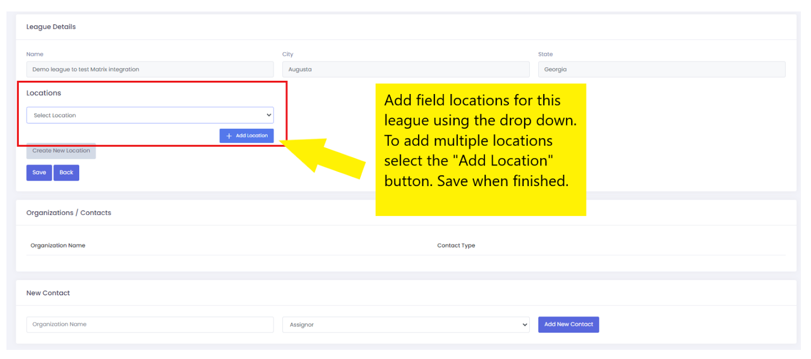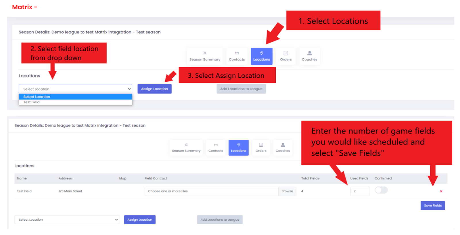 Go to Leagues > Season Details > View and ensure the locations you’ve added are linked to your upcoming season.