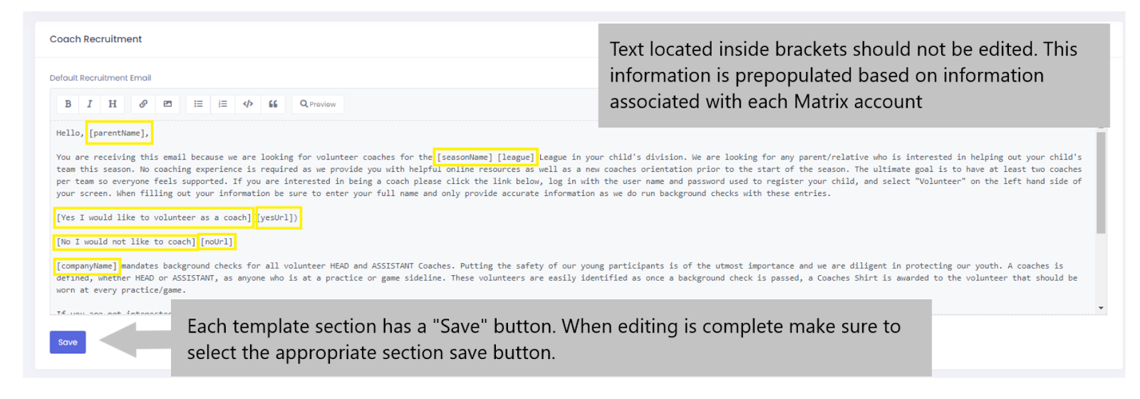Under Admin > Message Templates, review the default email templates provided. You can customize the verbiage to match your organization’s tone, but leave any content in brackets [ ] as is, since these are system-generated details.