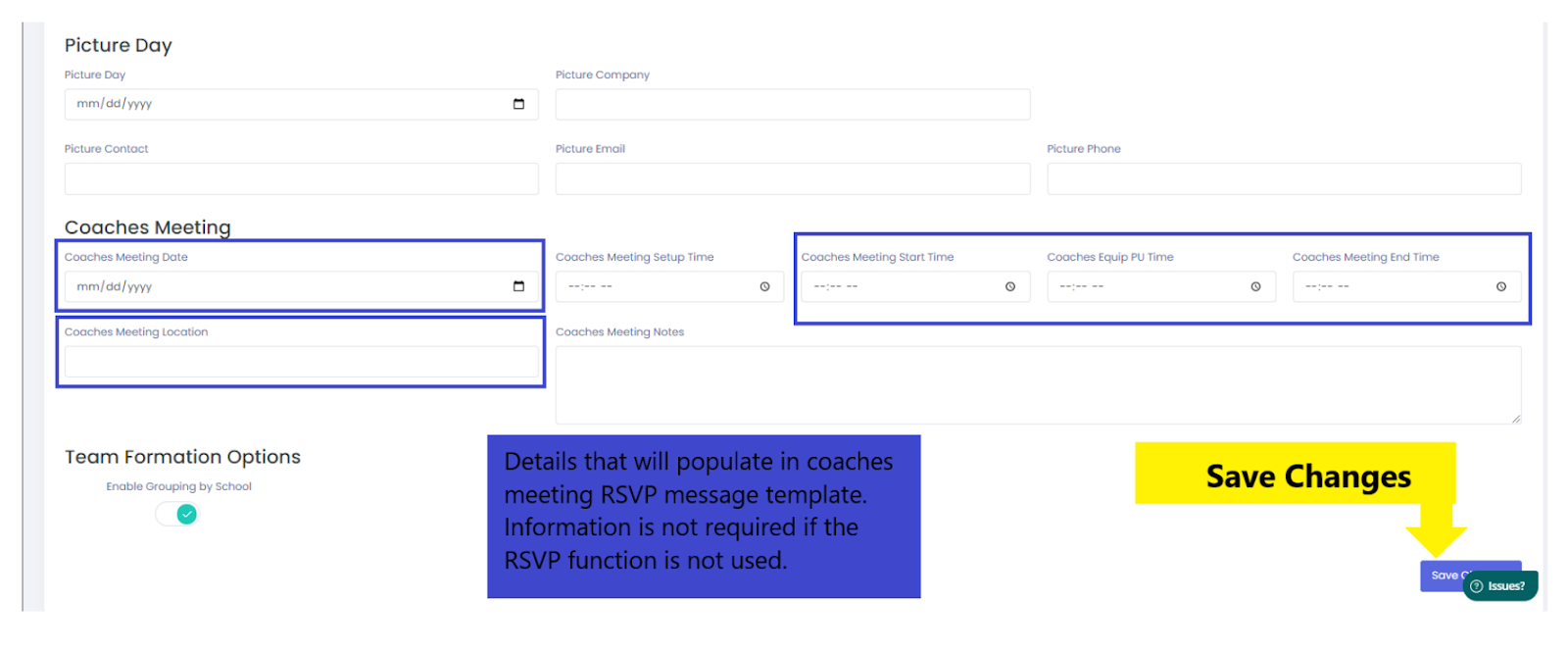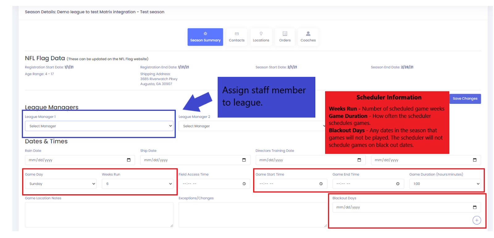 Head over to Leagues > Season Details > View. Complete the required fields (marked in red) for the scheduling tool. Items in blue are recommended, but not mandatory.