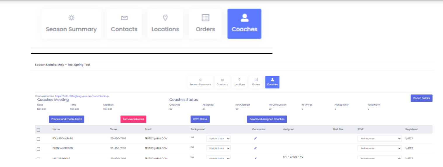 All coaches, whether imported from Sports Connect or uploaded manually, can be found in the Season Details section under the Coaches tab. This tab provides league organizers with all necessary coach information.
