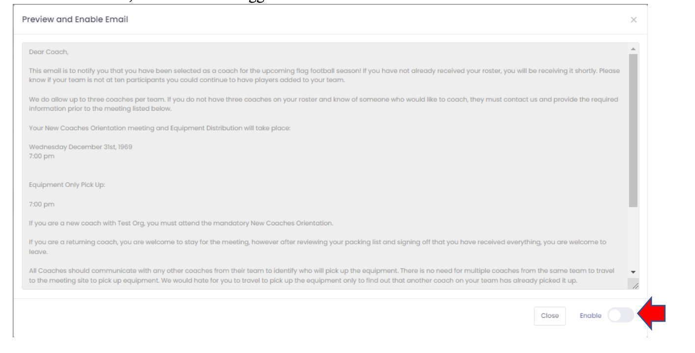 League operators can preview and enable an email invitation for the coaches meeting held each season. This is not a general welcome email but specifically designed for coaches' meetings.