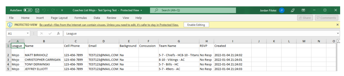 League operators can download an Excel file with all the coach information displayed on the Coaches section for assigned teams. This includes name, contact details, background check status, concussion certification results, and RSVP statuses.