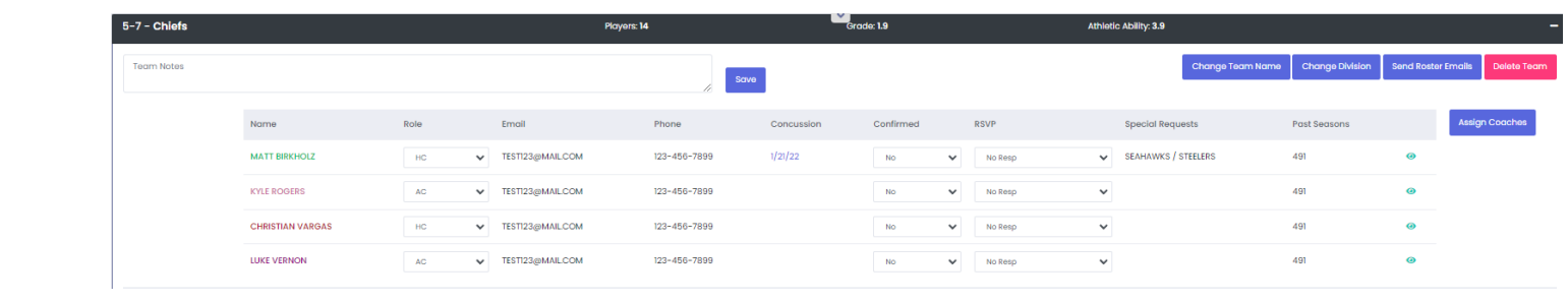 From the team assignments section, league operators can view and update each coach's role (Head Coach or Assistant Coach) and their confirmation status. You can also update the Coaches Meeting RSVP status in this section.